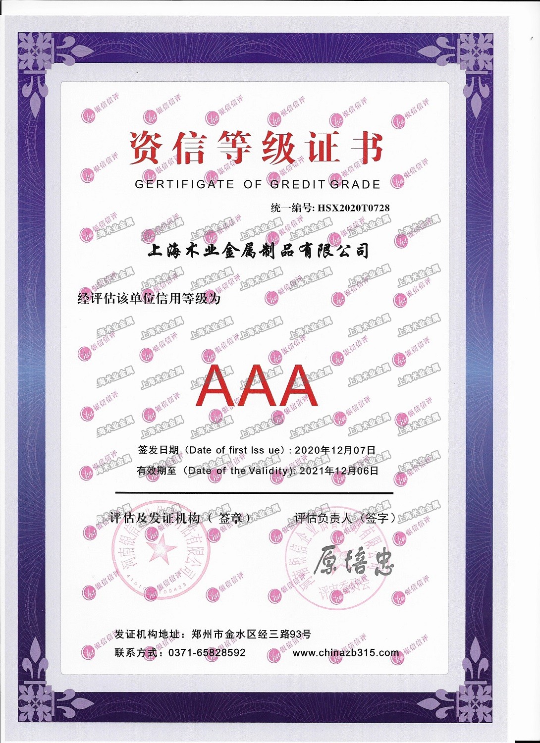 3.2020年12月7日,榮獲資信等級證書。上海術業(yè)金屬制品有限公司經(jīng)評估該單位信用等級為AAA(發(fā)證機構地址:鄭州市金水區(qū)經(jīng)三路93號;統(tǒng)一編號: HSX2020T0728)